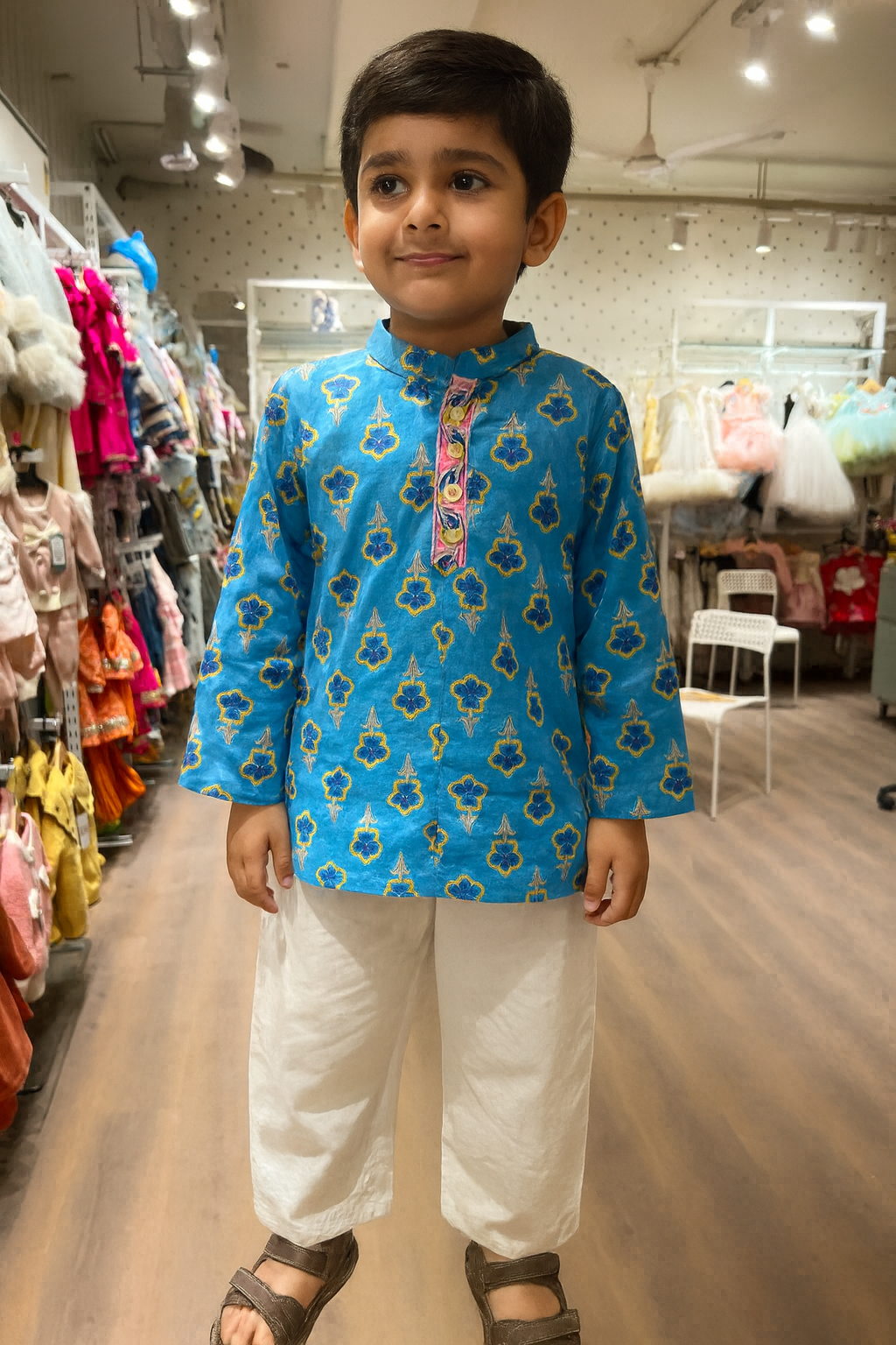 Let your little prince shine bright in our Blue Blossom Kurta Set β where comfort meets charm! πThis hand-block printed kurta in vibrant turquoise blue is crafted from soft, breathable cotton, perfect for festive days and family gatherings. The playful floral motifs and contrast button placket add just the right touch of color and style. Paired with easy-fit white cotton pants, this outfit keeps your boy looking effortlessly adorable and feeling super comfortable all day long.