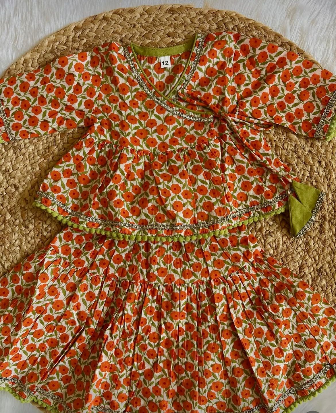 A twirl of tradition with a dash of playfulness! This vibrant angrakha-style set is crafted in soft breathable cotton for all-day comfort. The cheerful orange floral print with delicate trims makes it perfect for festive celebrations, photoshoots, or just a day full of smiles.