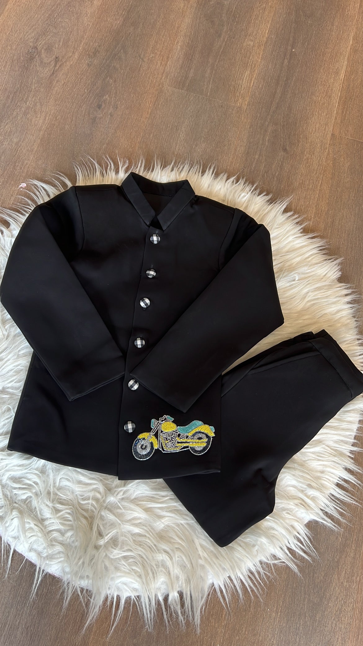 This elegant Achkan set is crafted in premium Japanese fabric, offering a rich yet lightweight feel. The highlight is the finely hand-embroidered bike motif, adding a playful and boyish charm to the classic silhouette. Designed with a perfect balance of Indo-Western style, this outfit is versatile and can be worn on any occasion — from festive celebrations to stylish gatherings. A unique blend of sophistication and youthful energy, it’s the perfect choice for little boys who love to stand out.