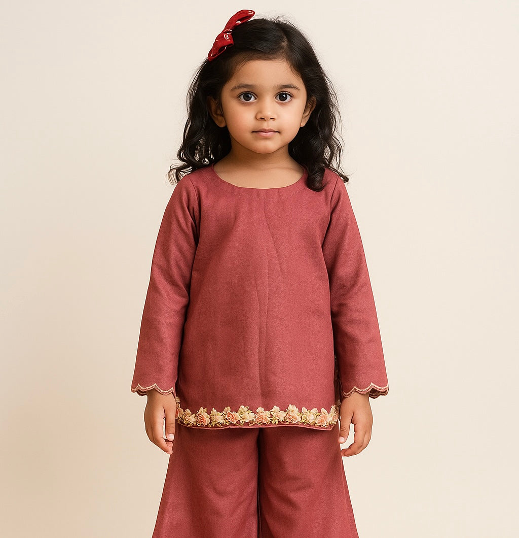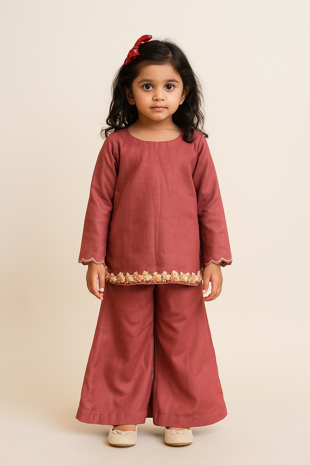 Soft, subtle, and effortlessly elegant β this Rosy Grace Set is a picture of timeless charm. π· Crafted in a soothing dusty rose shade, the kurta features delicate scalloped sleeves and intricate floral embroidery along the hem, adding just the right touch of detail. Paired with flowy palazzo pants for a breezy, comfortable fit, this outfit blends sophistication with ease. Perfect for family gatherings, festive moments, or days when your little one deserves to feel extra special. β¨