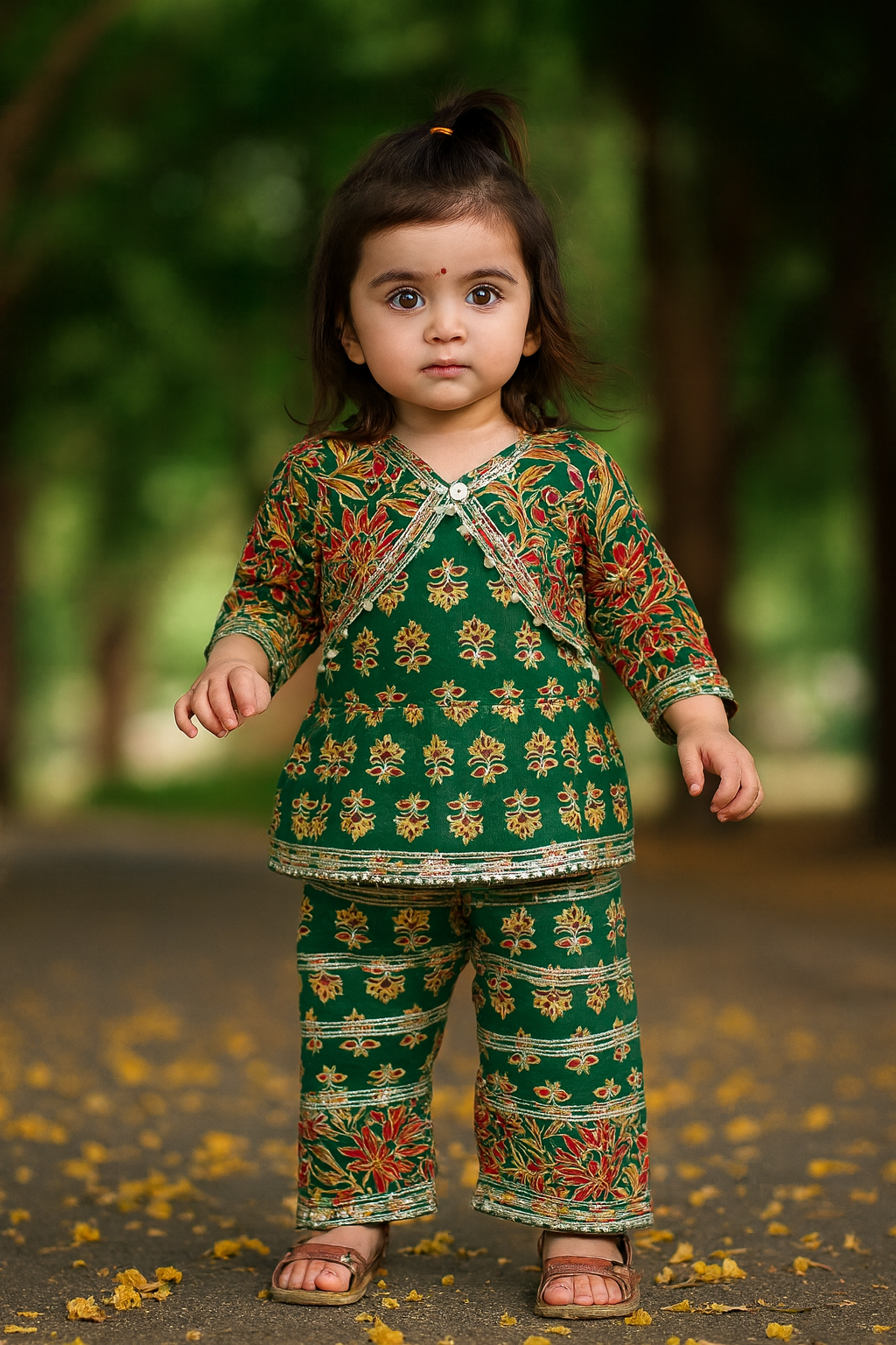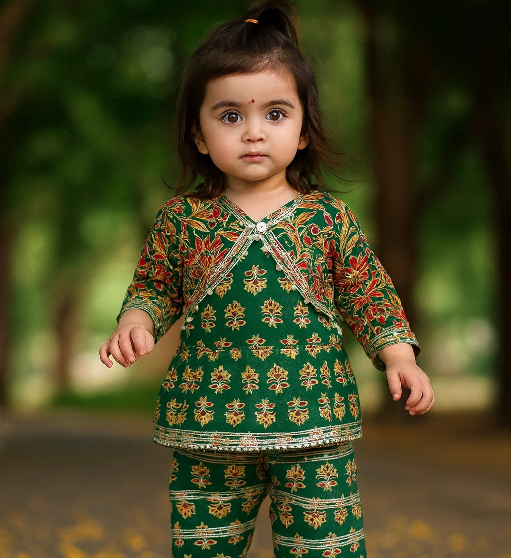 A timeless blend of tradition and charm, this beautiful green floral set is crafted to make your little one stand out effortlessly. The kurta features intricate traditional motifs with delicate zari-inspired detailing, paired with matching straight pants for a complete ethnic look. Perfect for festive celebrations, family gatherings, and special occasions, this outfit captures the essence of cultural elegance while ensuring absolute comfort for your child. The rich green base with vibrant floral patterns adds a refreshing touch of nature-inspired grace, making it a must-have statement piece in your princessās festive wardrobe.