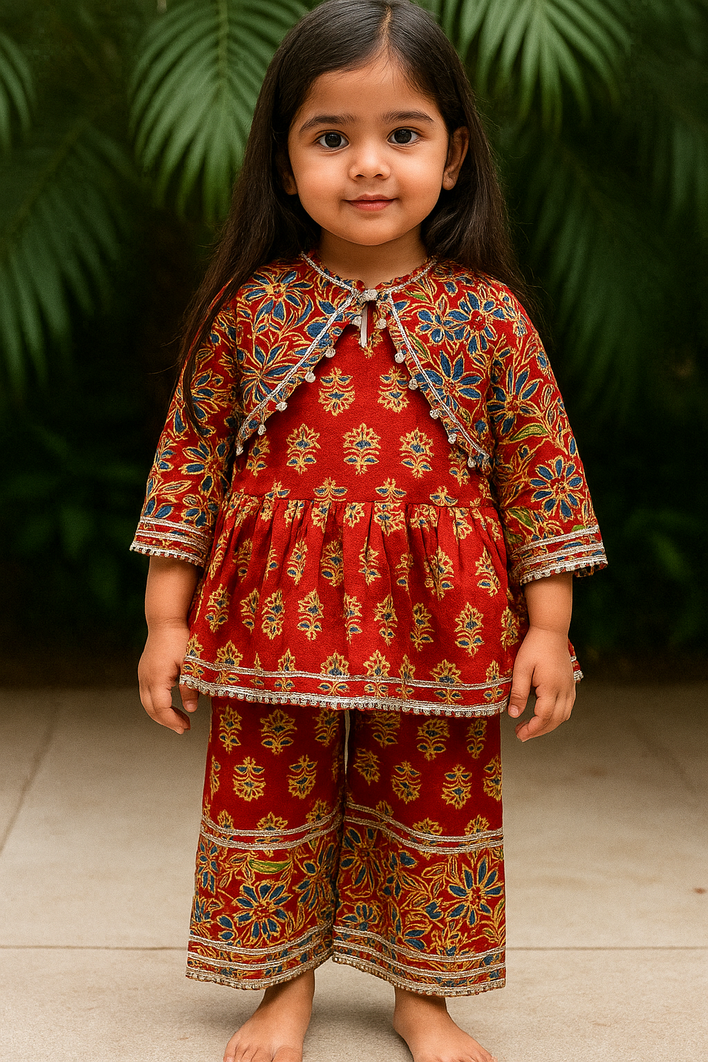 ✨ A vibrant rust-red ethnic co-ord set blooming with floral prints.Playful yet elegant, designed for comfort and festive charm. Perfect for little stars to shine bright at every celebration! 🌸