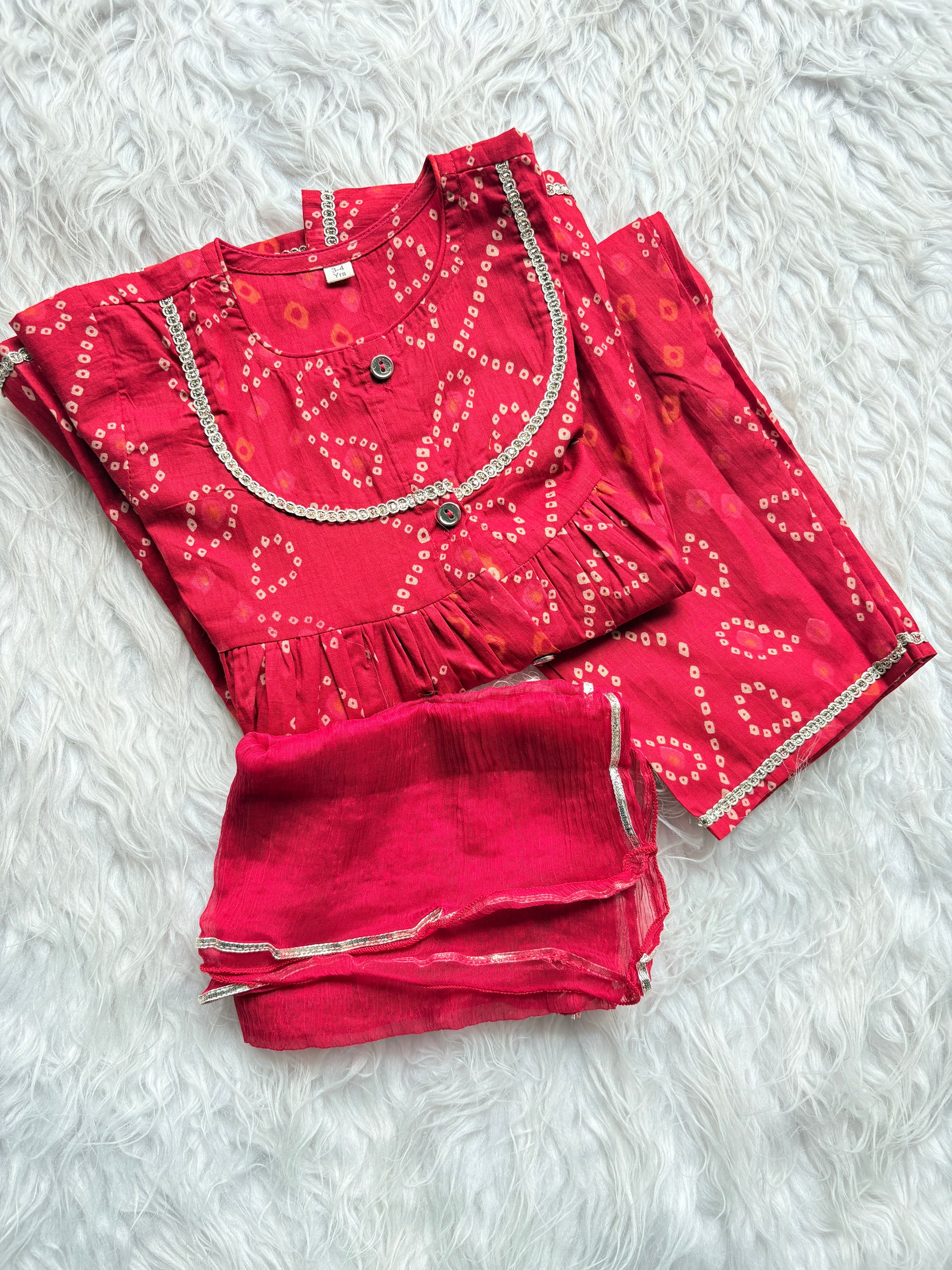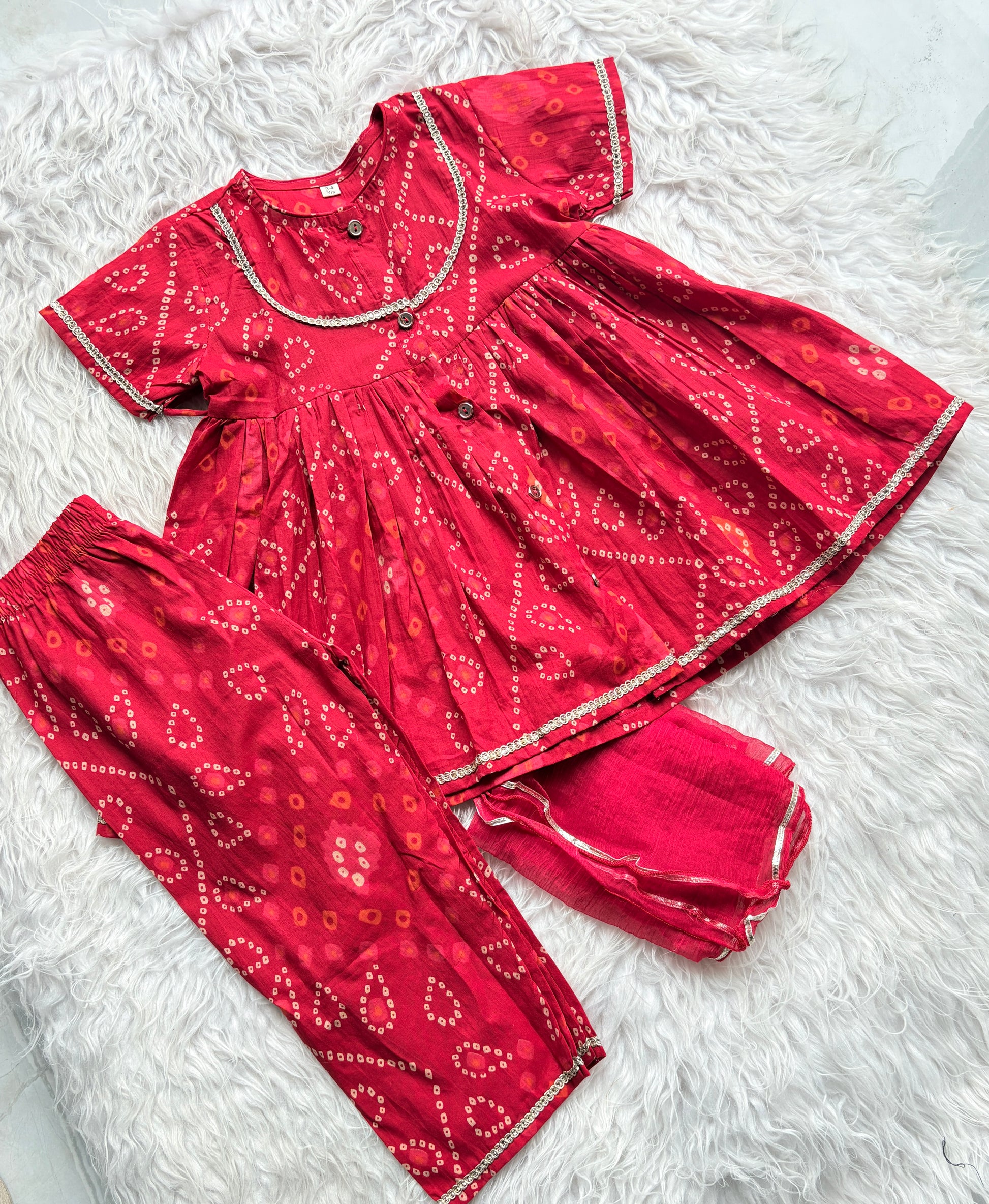 Bring festive vibes to your little one’s wardrobe with this vibrant red Bandhani 3- piece set. The outfit features a beautifully flared kurti with delicate gota lace details, paired with comfortable matching pants and a soft dupatta. Perfect for weddings, festive celebrations, or traditional gatherings, this set blends style, comfort, and culture effortlessly.
