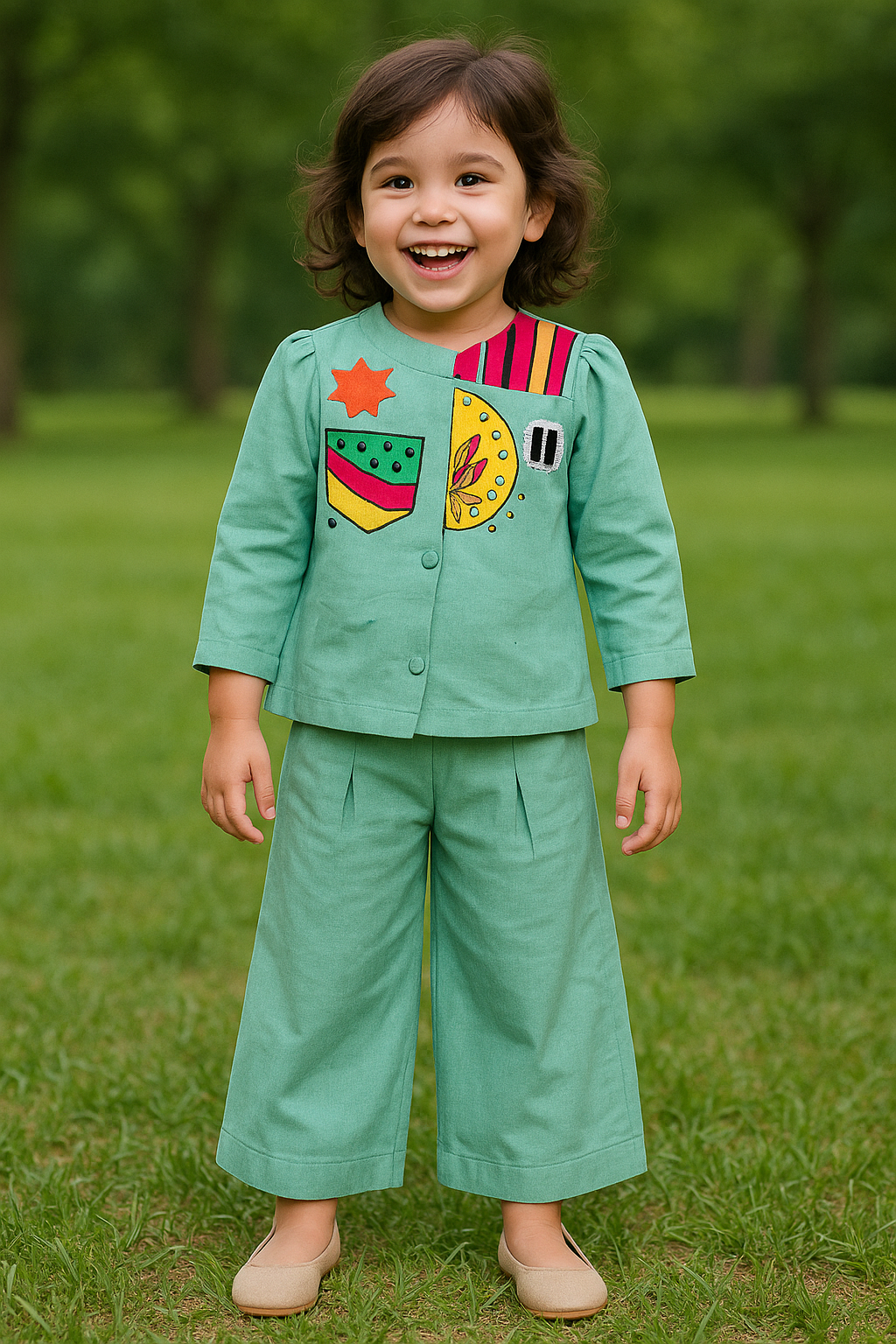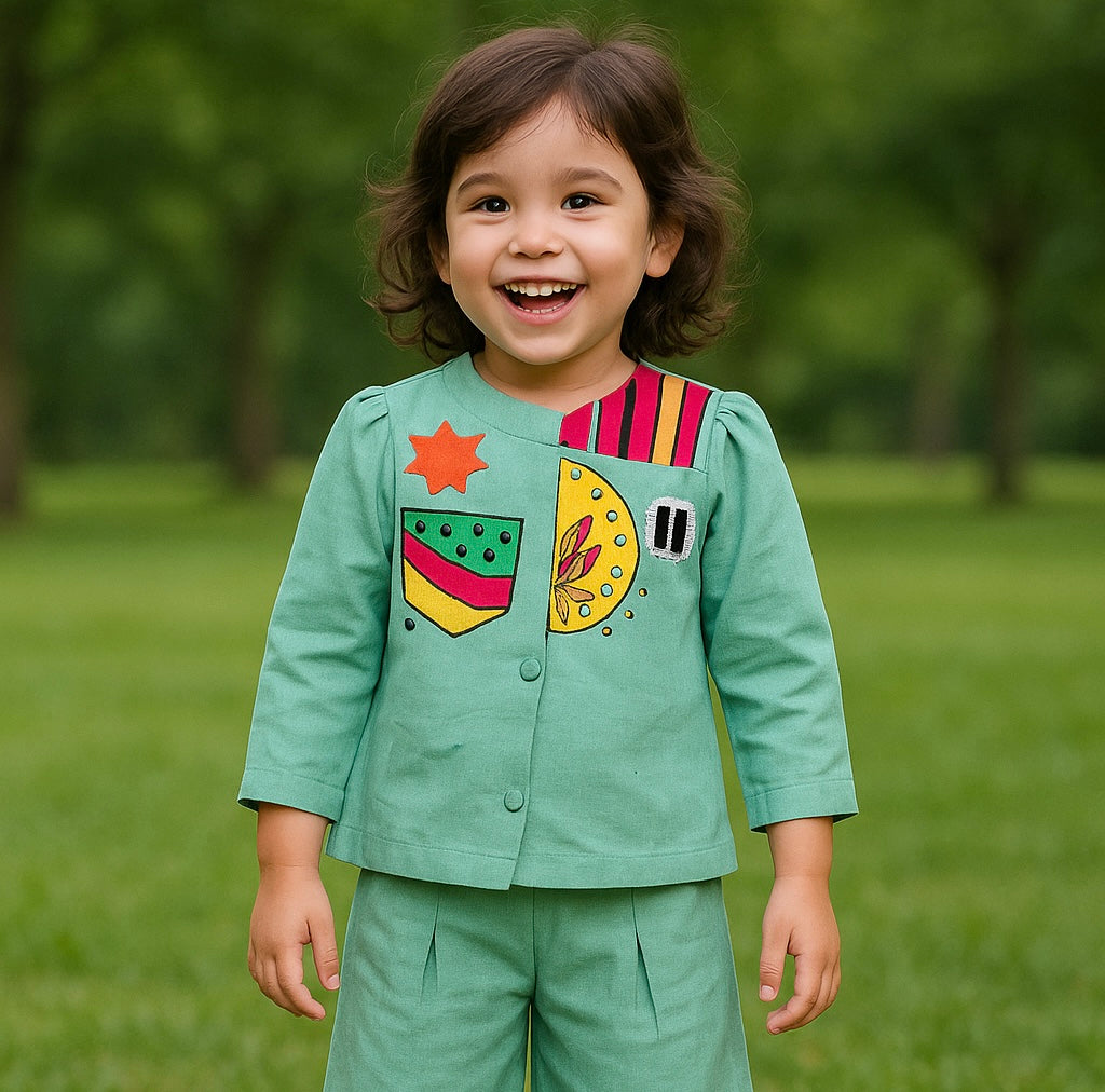 Let your little one shine in this adorable and vibrant co-ord set! Crafted in a soothing mint green shade, this outfit features playful and colorful appliqué details on the top, adding a fun and artistic charm. The soft, breathable fabric ensures all-day comfort, while the smart button-down top paired with wide-leg pants makes it perfect for playdates, outings, and festive celebrations. A cheerful blend of comfort and creativity — this outfit is sure to become your child’s new favorite! 🌈👶