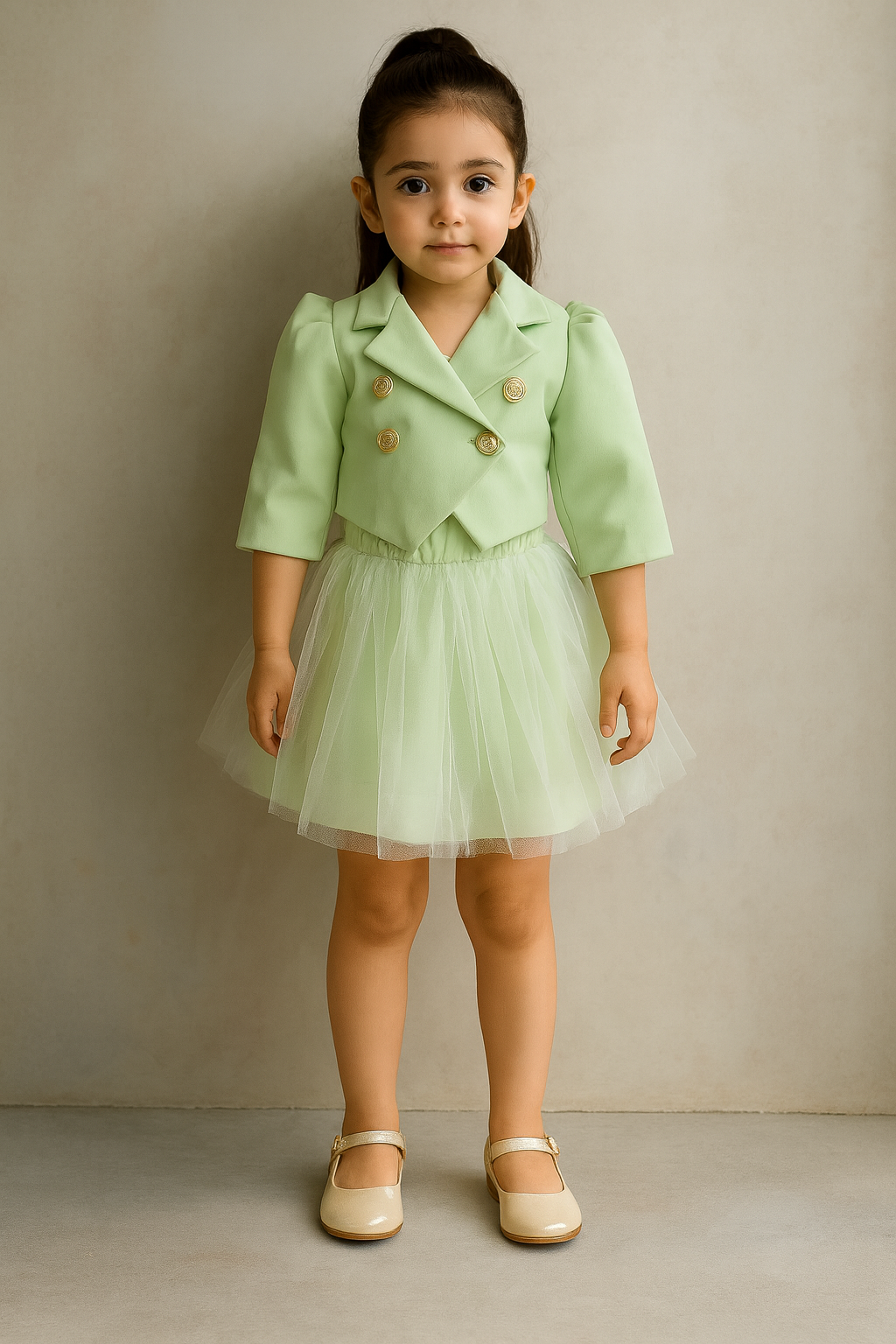 ✨ “A perfect blend of boss-babe charm and princess vibes – this pastel mint outfit features a chic blazer-style top with golden buttons paired with a dreamy tulle skirt. Stylish yet playful, it’s made for little fashionistas who love to shine with elegance and cuteness in every step.” ✨