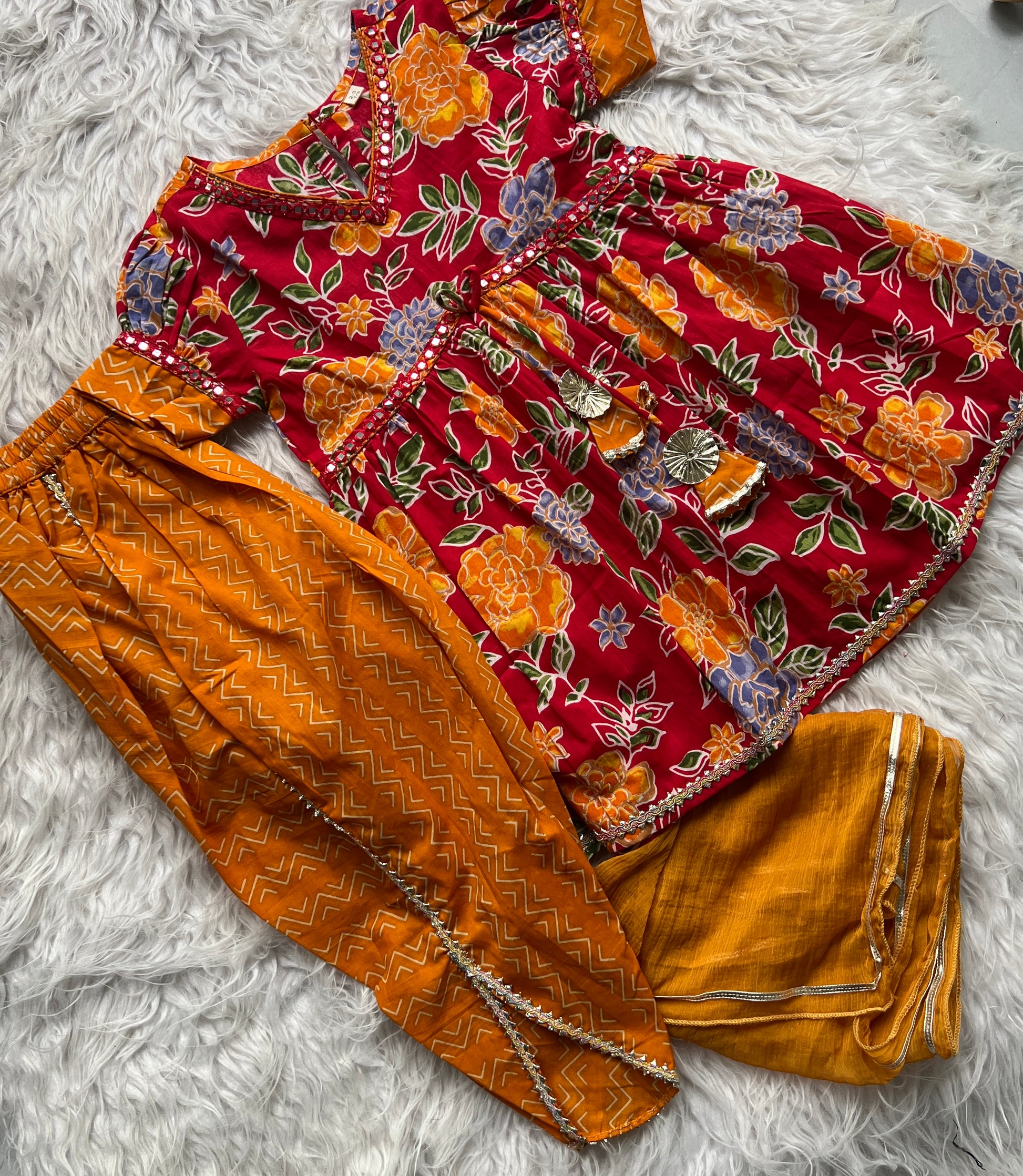 Step into tradition with this exquisite Rajasthani suit, a celebration of vibrant colors, intricate patterns, and timeless elegance. Featuring authentic prints and delicate embroidery inspired by Rajasthan’s cultural heritage, this suit beautifully blends comfort with festive charm. The flowing silhouette ensures ease of movement, while the vivid hues and handcrafted details add a regal touch. Perfect for weddings, festive occasions, or cultural celebrations, this Rajasthani suit is a true reflection of ethnic grace and royal artistry.