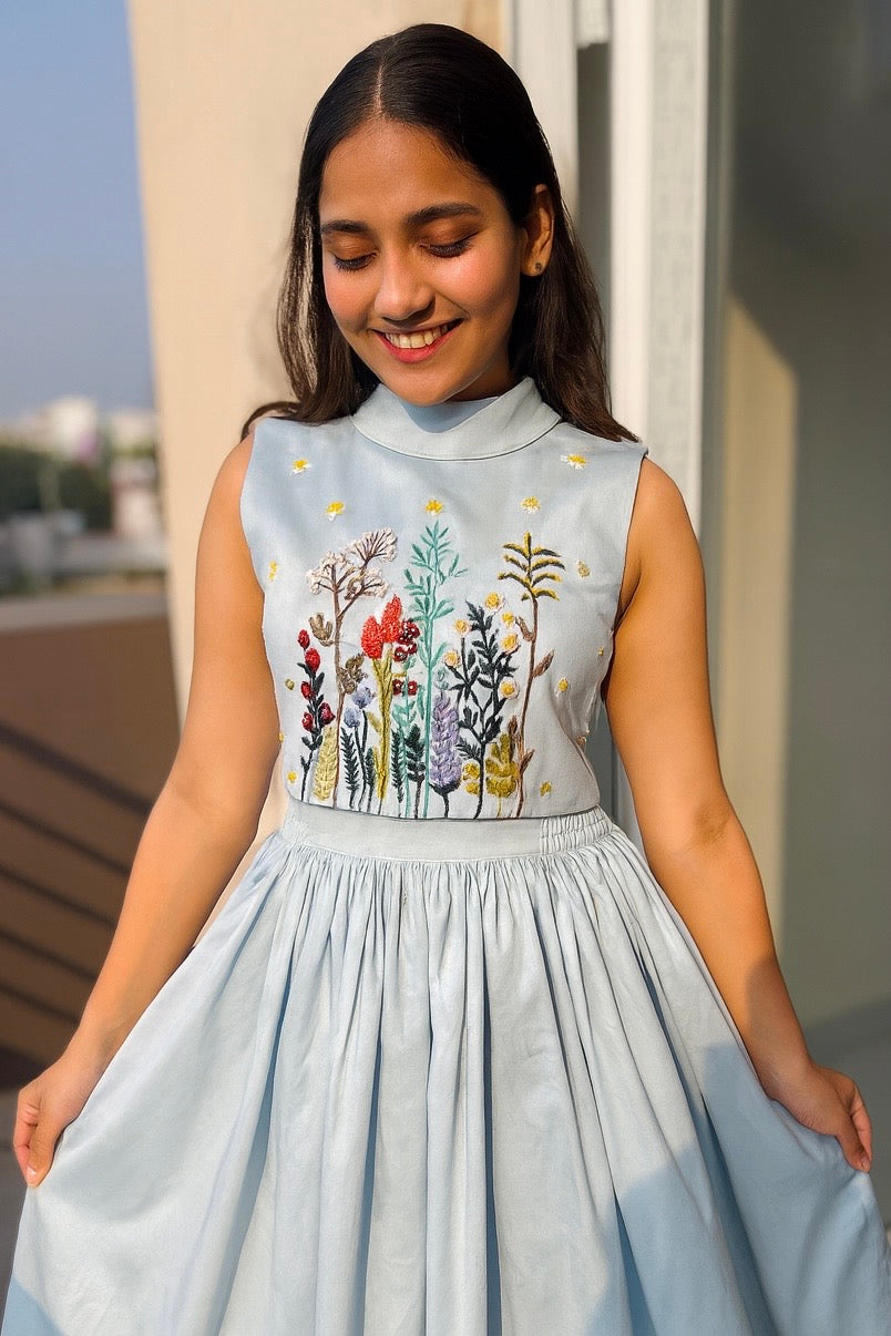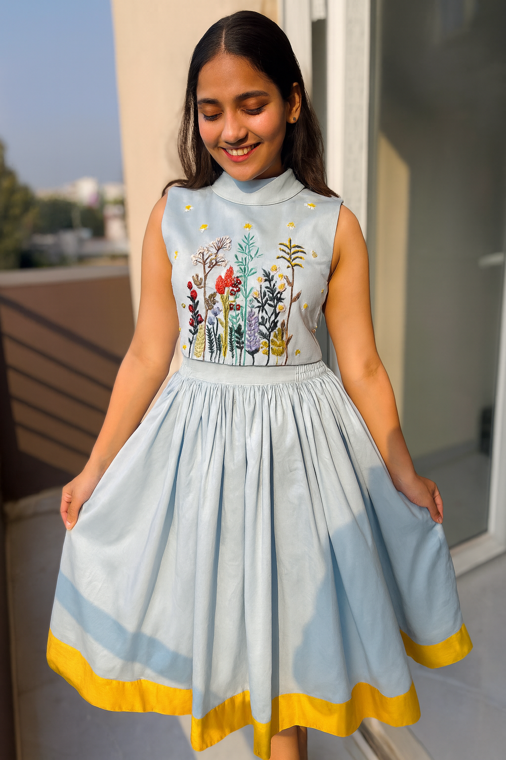 A soft sky-blue sleeveless dress adorned with vibrant floral embroidery on the bodice, bringing a garden of colors to life. The flowy pleated skirt is highlighted with a cheerful sunshine-yellow border, adding a playful yet classy contrast. Perfect for a sunny day outing, festive celebration, or a casual chic look — this dress radiates freshness, charm, and youthful elegance.