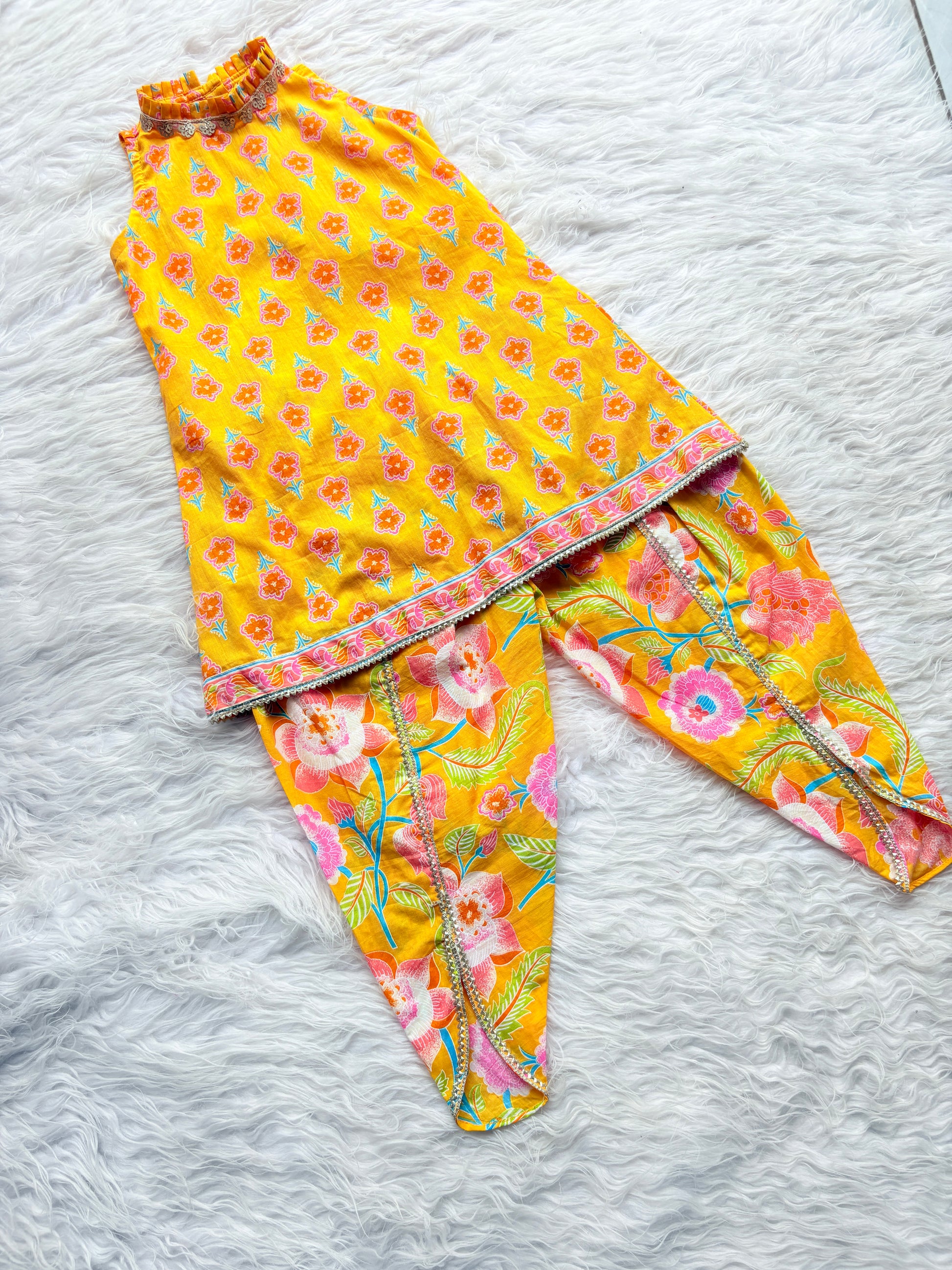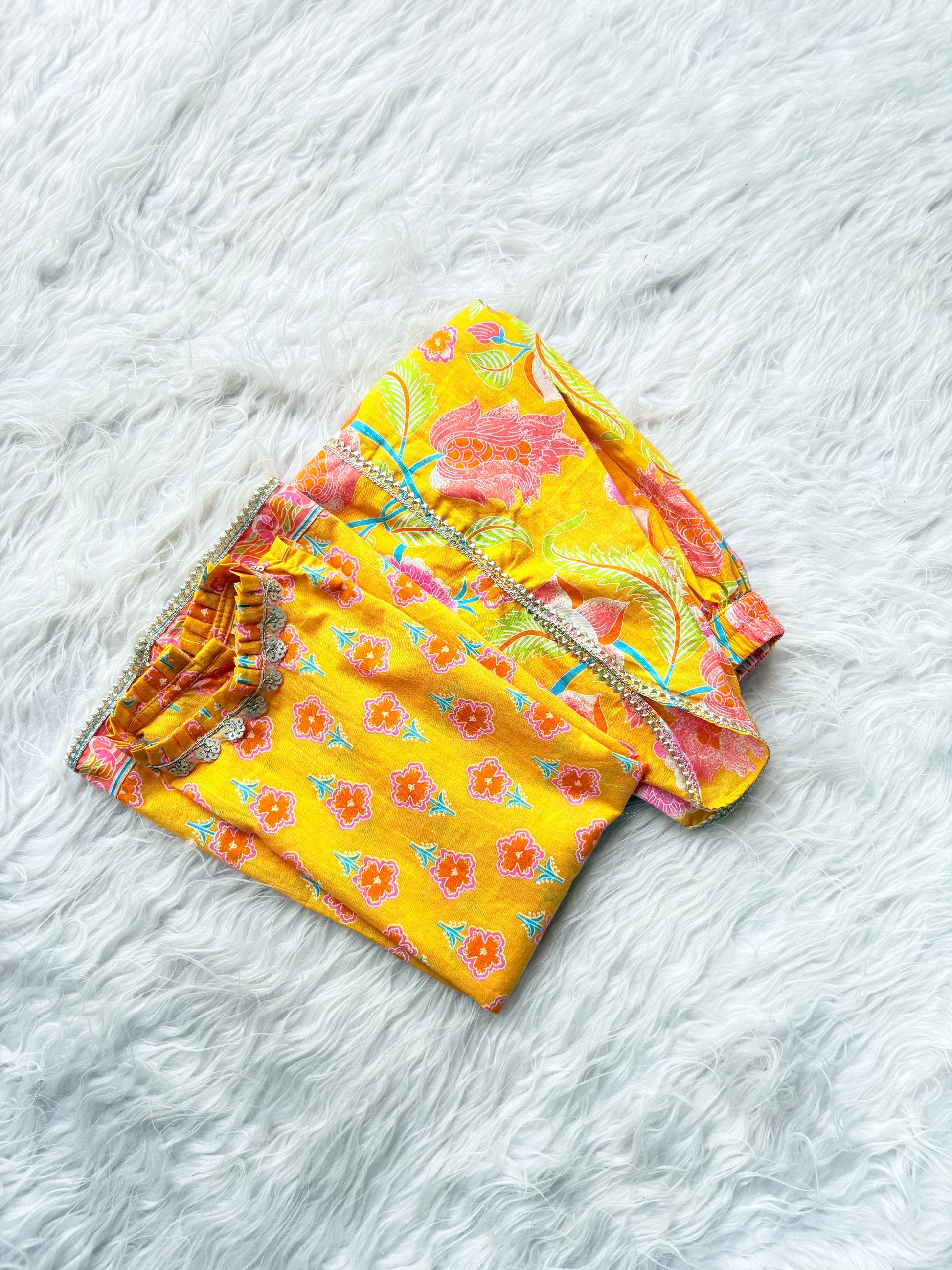 A burst of sunshine and cheer, this vibrant yellow kurta tulip pent set is crafted in soft cotton with playful floral prints. The sleeveless top features a gathered neckline and delicate border detailing, while the matching bottoms add a touch of charm with their bold, colorful blooms. Breezy, comfortable, and full of joy β€” this outfit is perfect for festive occasions, summer outings, or casual celebrations.