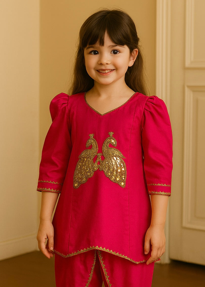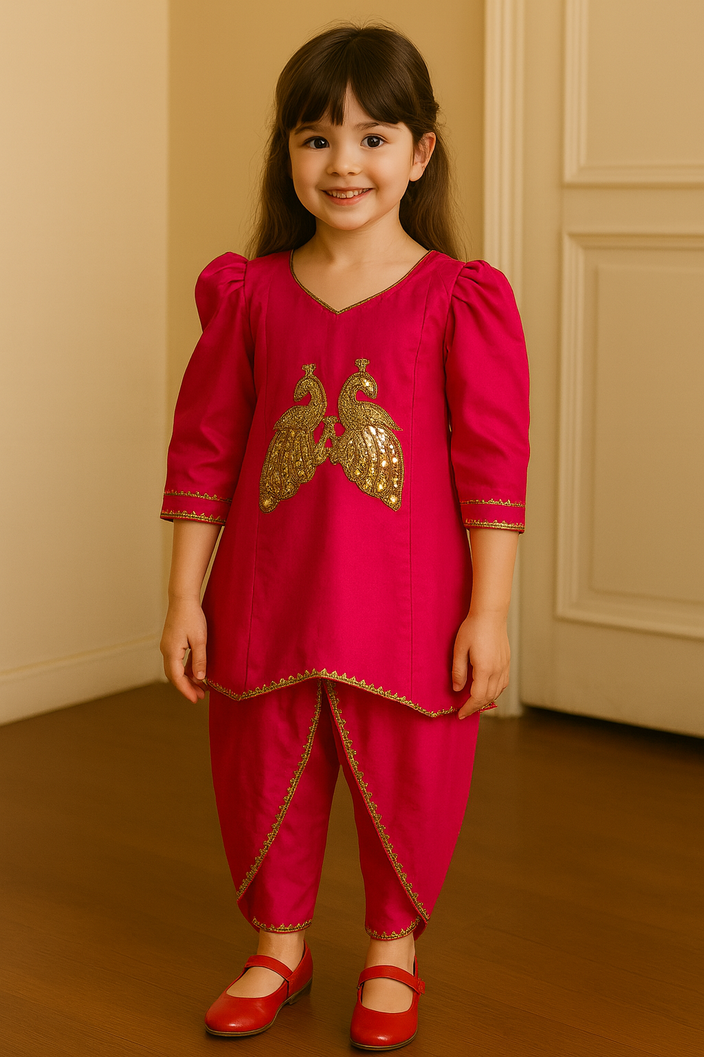 β¨ βA royal pop of fuchsia with golden peacock elegance π¦β¨ β this dhoti-kurta set blends tradition and style, making your little princess shine at every festive occasion.β β¨